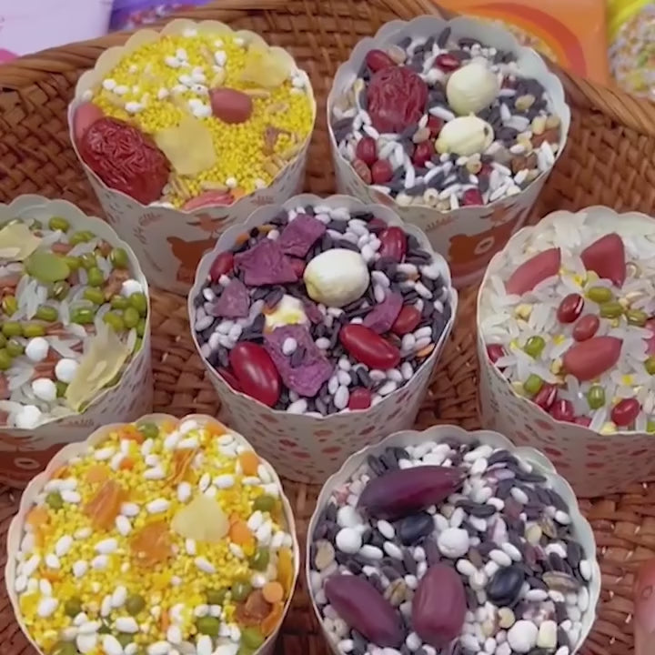 - Cháo rau củ sắc màu: Gạo nếp, gạo thơm nhật, gạo vàng, , đậu đỏ, khoai lang, hạt bí, cao lương, chà là, hạt sen, táo đỏ, cà rốt"